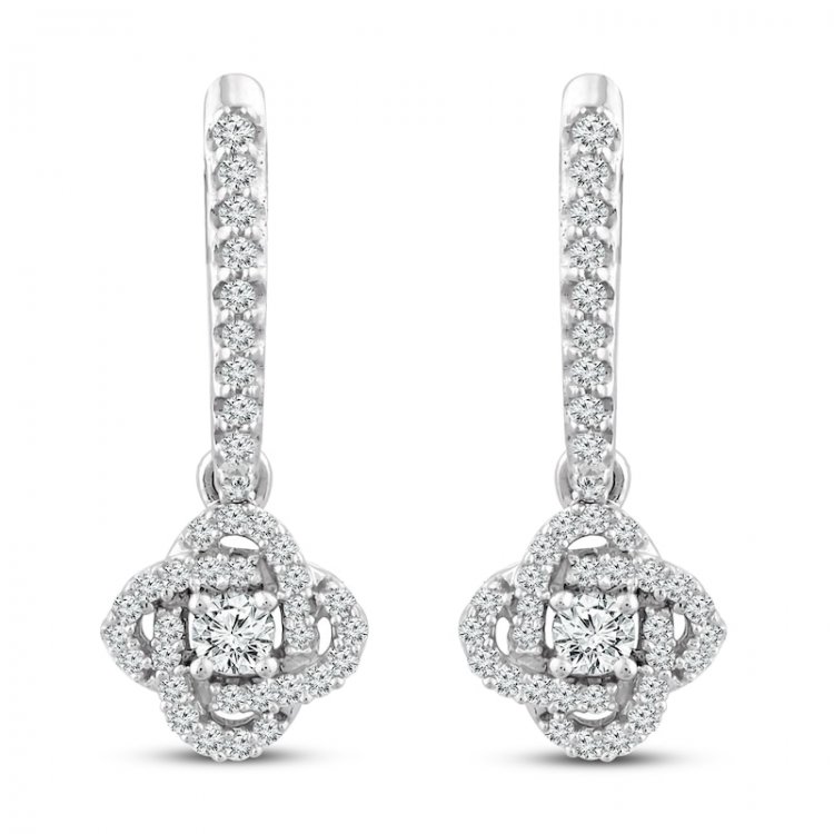 Turn heads with these elegant and meaningful diamond drop earrings From the Center of Me collection, the earrings serve as a reminder that through life's twists and turns, love keeps you centered Crafted of 10K white gold, the earrings feature an interwoven design that sparkle with round diamonds throughout The center of each drop earring features a larger round diamond, bringing the pair's total diamond weight to 1/3 carat The earrings secure with friction backs