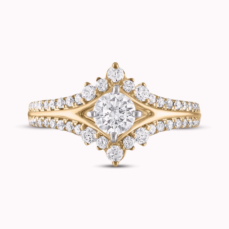 A stunning 1/2-carat round diamond sparkles at the center of this exquisite engagement ring. Set in timeless 14K yellow gold, the band is lined with two rows of brilliant round diamonds. The ring has a total diamond weight of 1 carat.